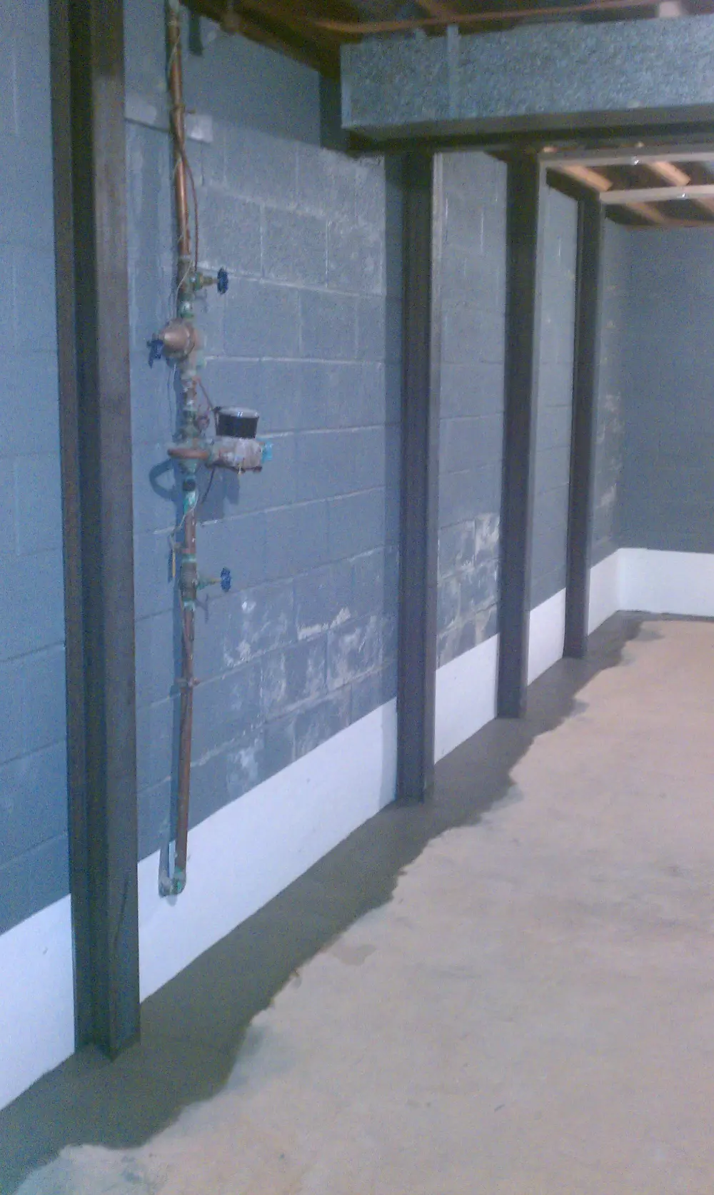 Armored Basement Waterproofing installs heavy-duty galvanized steel I-beams vertically along the affected wall to brace it against further inward movement.